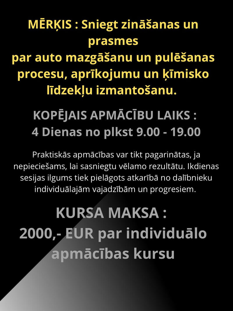 Mūsu apmācību mērķis ir sniegt praktiskas zināšanas un prasmes auto virsbūves pulēšanā, automašīnu mazgāšanā, aprīkojuma un ķīmisko līdzekļu pareizā izmantošanā. Kursu laikā dalībnieki apgūst gan teoriju, gan praktiskās iemaņas, kas nepieciešamas, lai strādātu profesionāli auto kopšanas jomā.